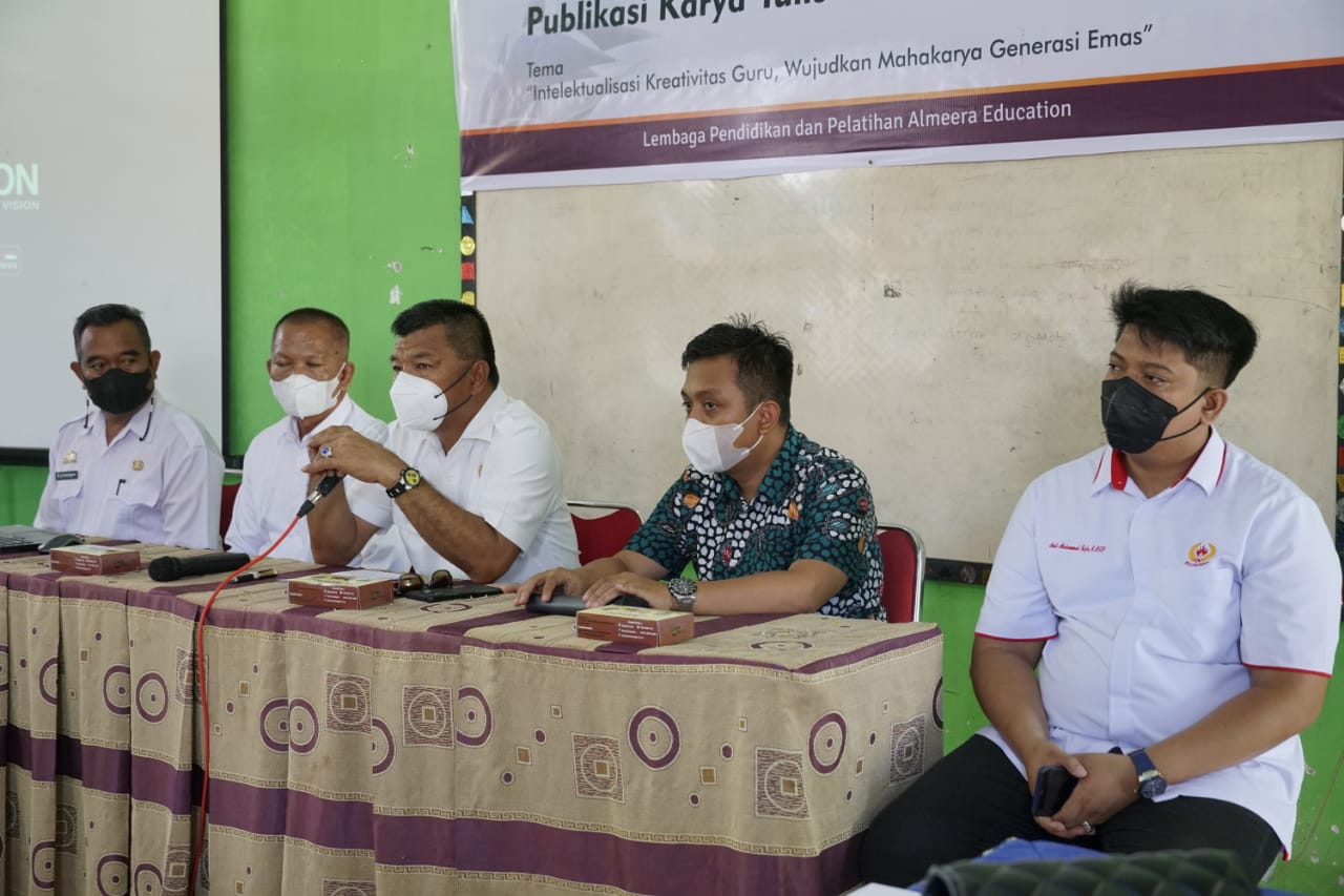 Direktur Almeera Dr. Mulawakkang Firdaus menyampaikan guru yang mengikuti pelatihan sebanyak 80 peserta dari 42 sekolah dalam rangka memberikan penguatan kapasitas para guru guna menumbuhkan kreatifitas dan inovasi para guru dalam mewujudkan maha karya Generasi Emas di Kabupaten Bulukumba.