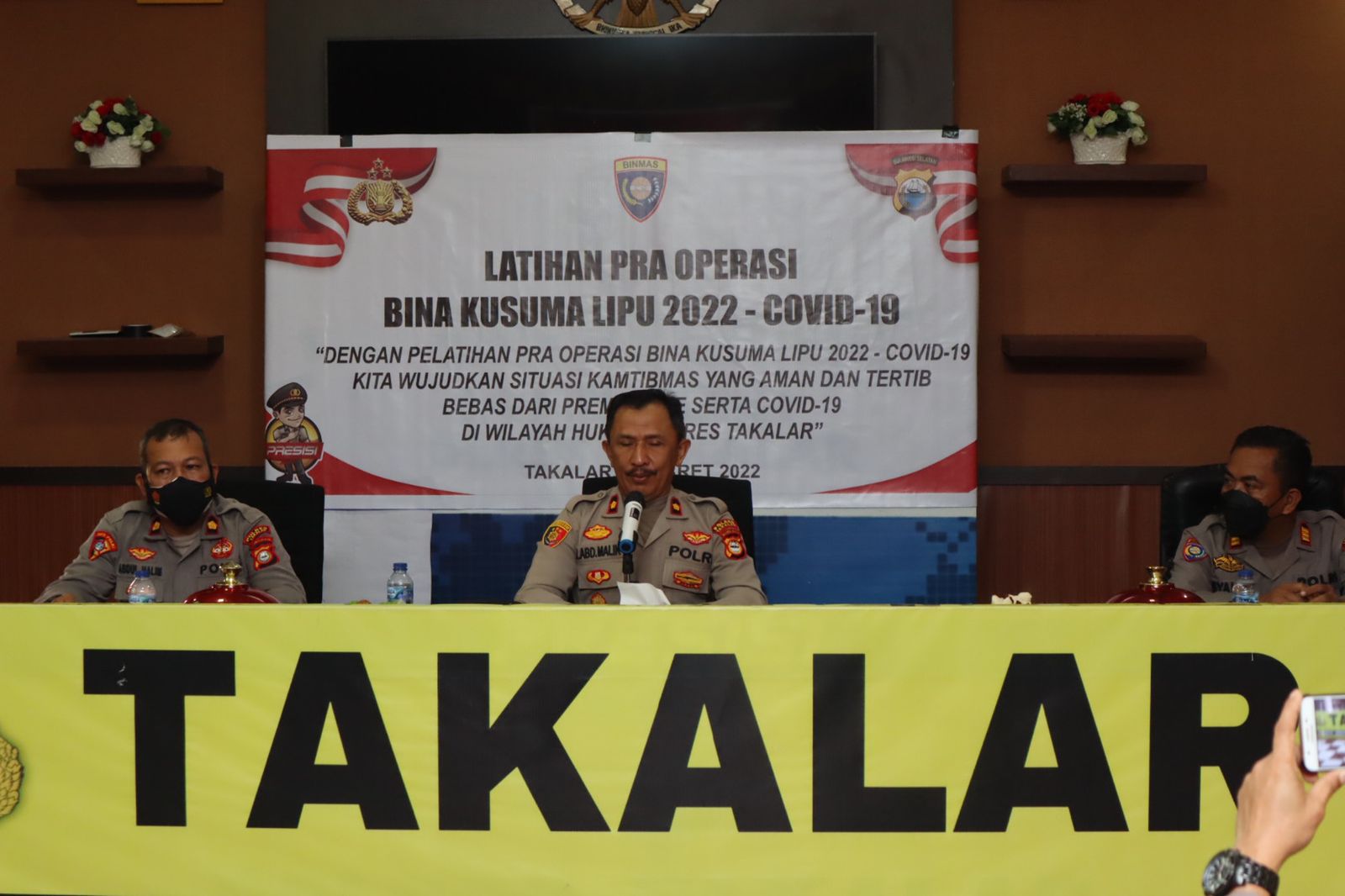 Kegiatan latihan Pra Operasi Bina Kusuma 2022 dalam rangka memelihara keamanan dalam Negeri di tengah masa Pandemi Covid-19, yang dilaksanakan di Aula 99 Mapolres Takalar dengan mengangkat tema ” Dengan Pelatihan Pra Operasi Bina Kusuma Lipu 2022 – Covid-19, ”Kita Wujudkan Situasi Kamtibmas Yang Aman dan Tertib, Bebas Dari Premanisme Serta Bebas Covid 19 Di Wilayah Polres Takalar β€œ dipimpin langsung oleh Wakapolres Takalar Kompol H. Abd. Malik, S.H. Rabu (16/3/2022).