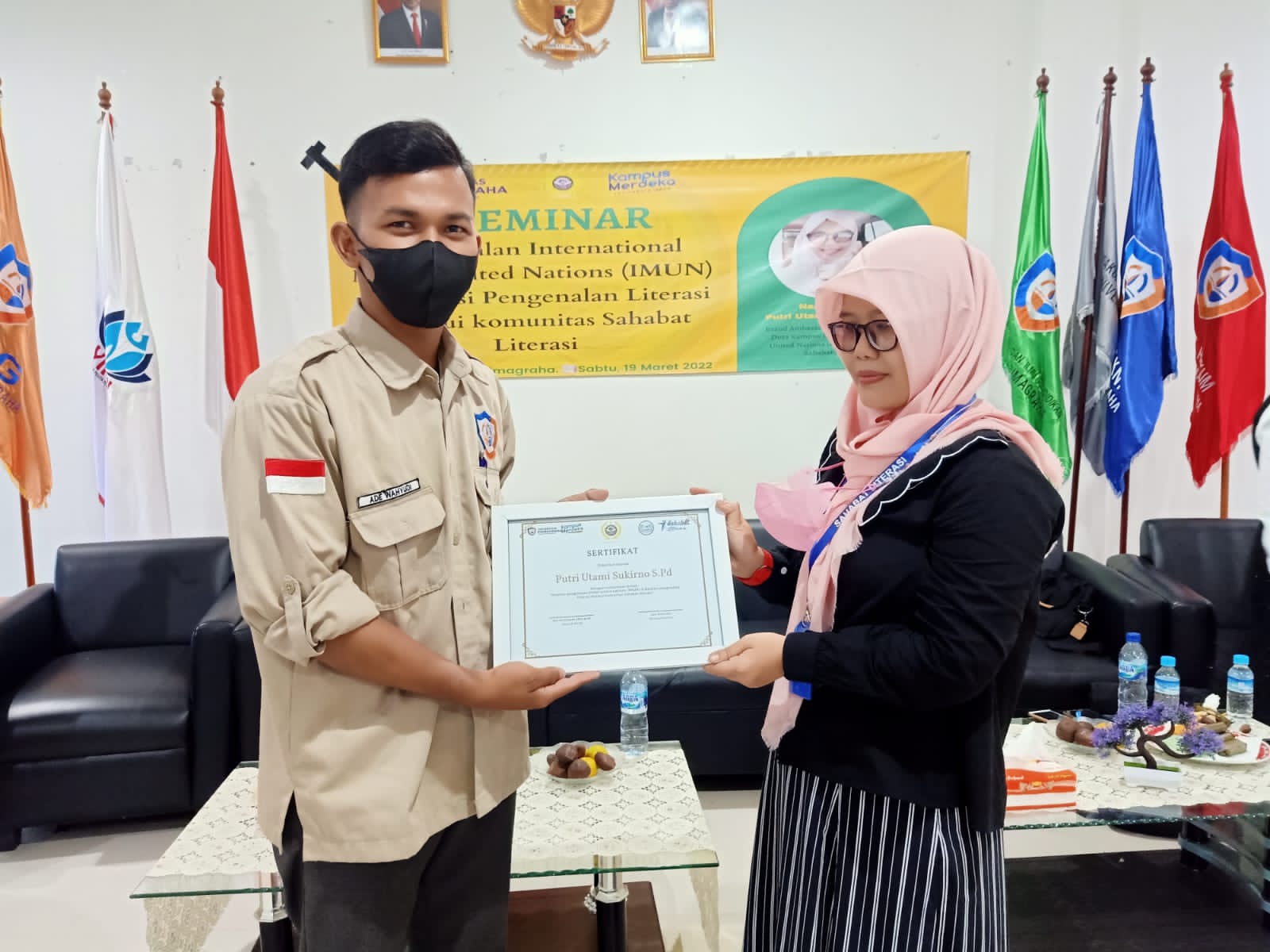 HALILINTARNEWS.id, SERANG – Himpunan Mahasiswa Pendidikan Guru Sekolah Dasar (HIMASDA) Universitas Primagraha mengadakan kegiatan seminar mengenai Pengenalan International Model United Nations (IMUN) dan Edukasi Pengenalan Literasi Melalui Komunitas Sahabat Literasi. Sabtu 19/03/2022