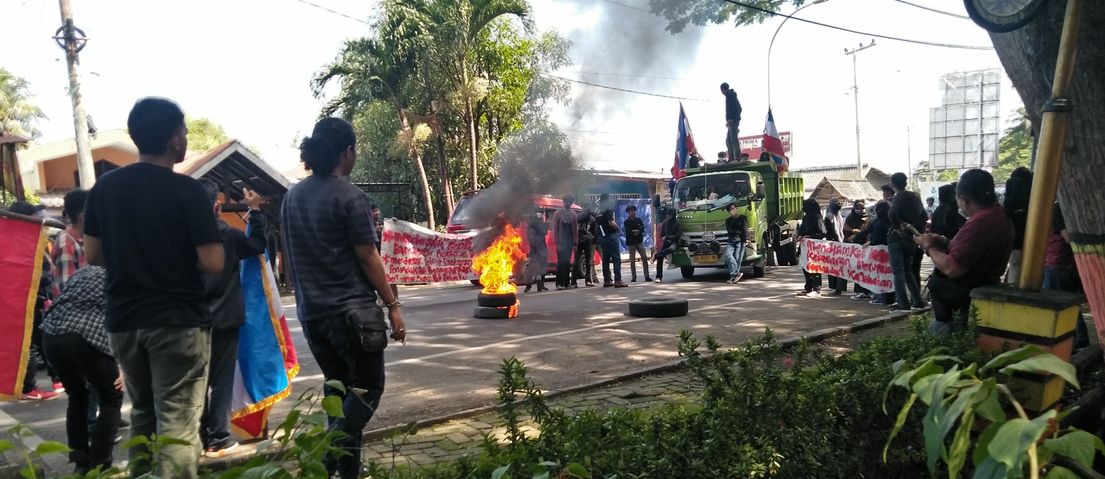 Sebelum memasuki massa aksi demonstrasi di ruang kantor DPRD Bantaeng, para massa sempat menutup jalan poros provinsi jurusan Bantaeng – Makassar -Bulukumba dengan memberhentikan mobil kontener dan membakar ban di tengah jalan mengakibatkan arus lalulintas macet total.