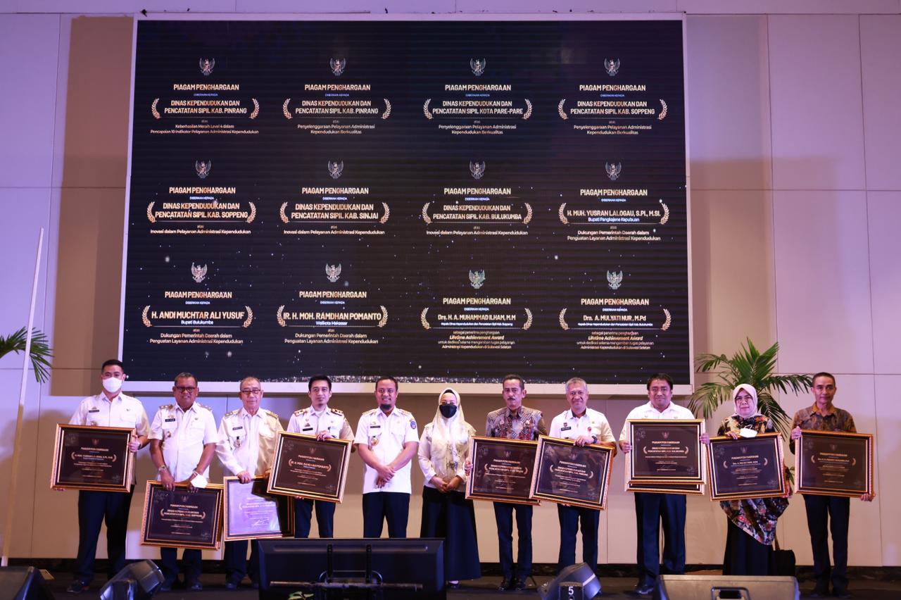 Diketahui, sebanyak tiga Pemerintah Daerah Provinsi Sulsel diberi penghargaan kategori dukungan daerah dalam penguatan pelayanan administrasi kependudukan yaitu Kota Makassar, Kabupaten Bulukumba dan Kabupaten soppeng.