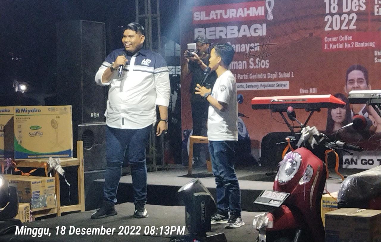 Calon anggota DPR RI Andi Anhar Rahman, S.Sos juga memberikan puluhan hadiah seperti sepeda motor, Rice Cooker, Hendpon, Kipas angin dan uang tunai.
