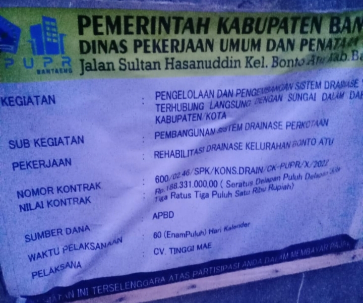 Berdasar dari informasi yang dihimpun media halilintarnews.id, diketahui bahwa proyek tahun 2022 tersebut, di kerjakan atas nama perusahaan CV. Tinggi Mae dengan Sumber anggaran APBD dengan nomor kontrak: 600/02.46/SPK/KONS.DRAIN/CK-PUPR/X/2022. Total anggaran sebesar Rp. 188.331,000,- (Seratus Delapan Puluh Delapan Juta Tiga Ratus Tiga Puluh Satu Ribu Rupiah). Waktu pelaksanaan 60 hari.