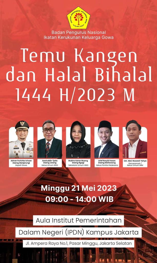 HALILINTARNEWS.id, JAKARTA—–Badan Pengurus Nasional Ikatan Kerukunan Keluarga Gowa (BPN IKKG) akan menggelar Temu Kangen dan Halal Bihalal 1444 H/2023 M dengan tema “Soliditas dan Sinergitas Untuk Kemaslahatan Bersama” bertempat di Aula Institut Pemerintahan Dalam Negeri (IPDN) Kampus Jakarta, Ampera, Jakarta Selatan, pada Minggu, 21 Mei 2023 mendatang.