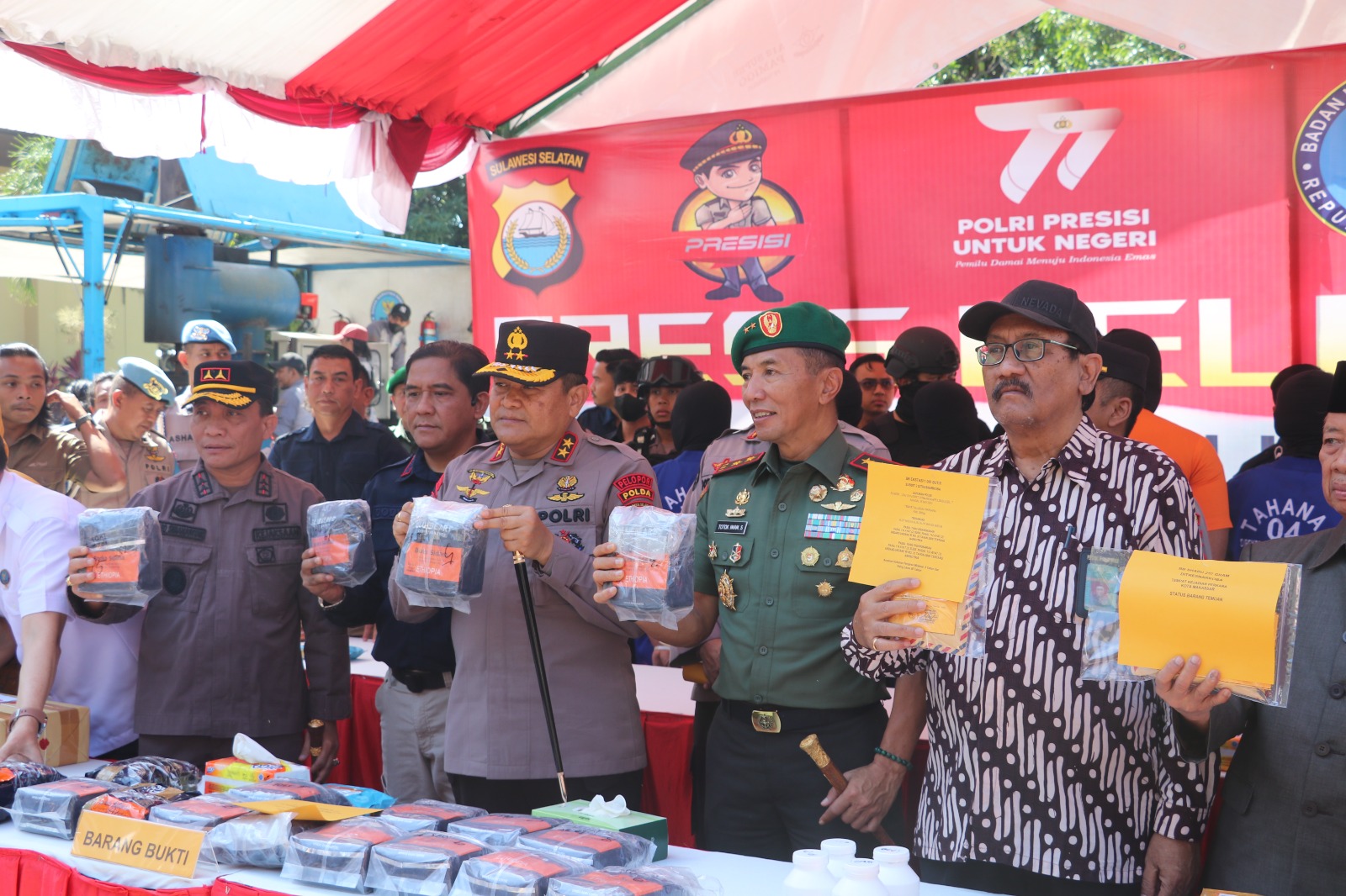 Disampaikan juga, Adapun barang bukti yang berhasil di amankan yaitu Shabu 78.165,363 gram (78 kg), Ekstasi 17.774 butir, Ganja 12.942,31 gram (12 kg), Daftar G 99.227 butir, T. Sintetis 1.356,73 gram (1 kg).