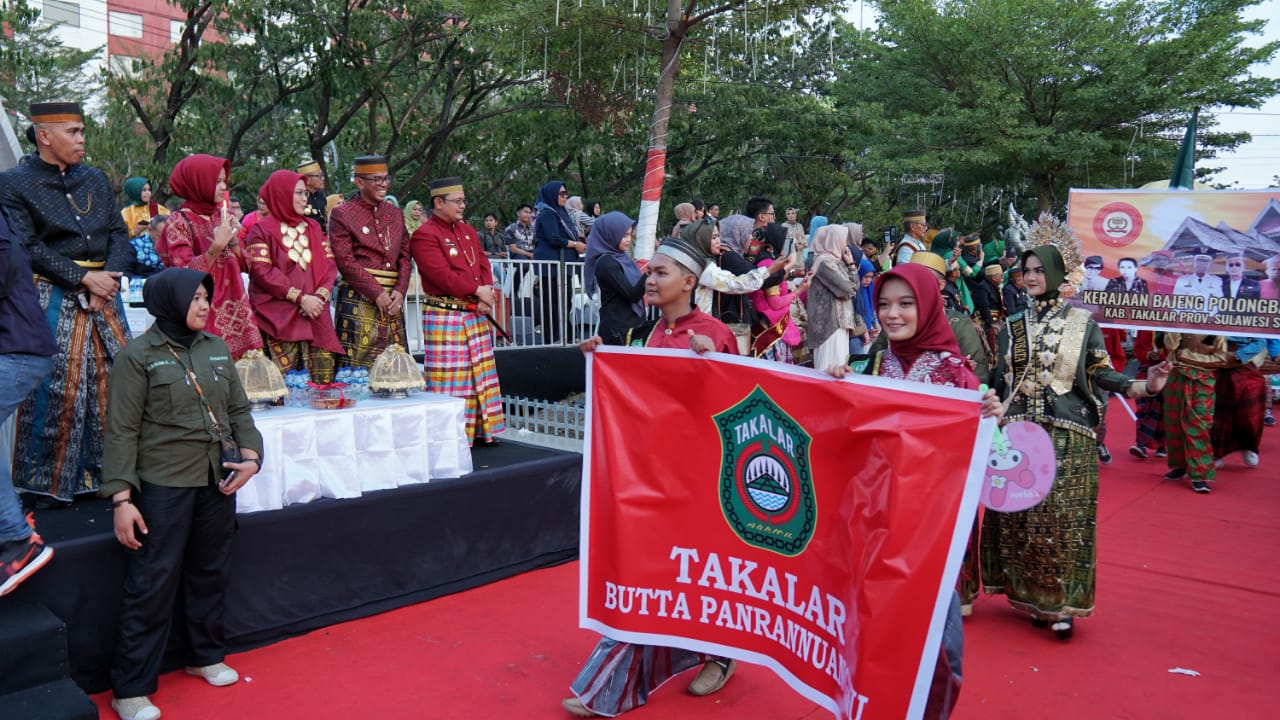 HALILINTARNEWS id, TAKALAR, Pj. Bupati Takalar Dr. Setiawan Aswad, M. Dev. Plg dan Pj. Ketua TP. PKK Kab. Takalar bersama jajarannya ikut meriahkan Kirab Budaya Hari Jadi Provinsi Sulawesi Selatan ke-354 yang dilaksanakan di Anjungan Pantai Losari, Sabtu (21/10).