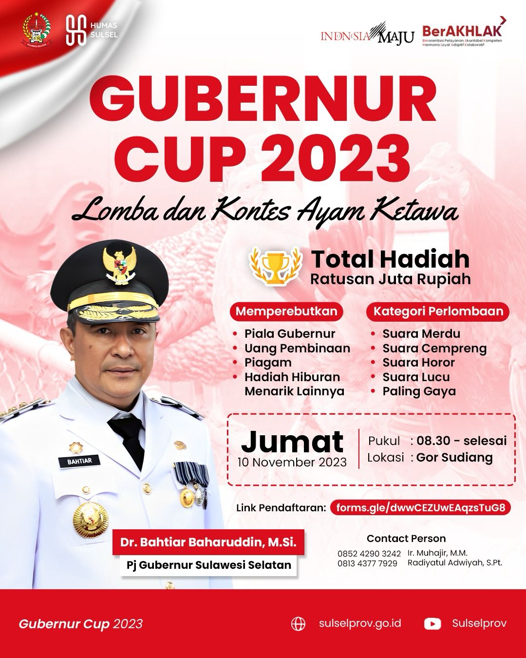 HALILINTARNEWS.id, MAKASSAR – Pemerintah Provinsi Sulsel akan menggelar Kontes Ayam Ketawa, Jumat, 10 November 2023. Lomba ini akan memperebutkan Piala Gubernur, selain hadiah uang jutaan rupiah.