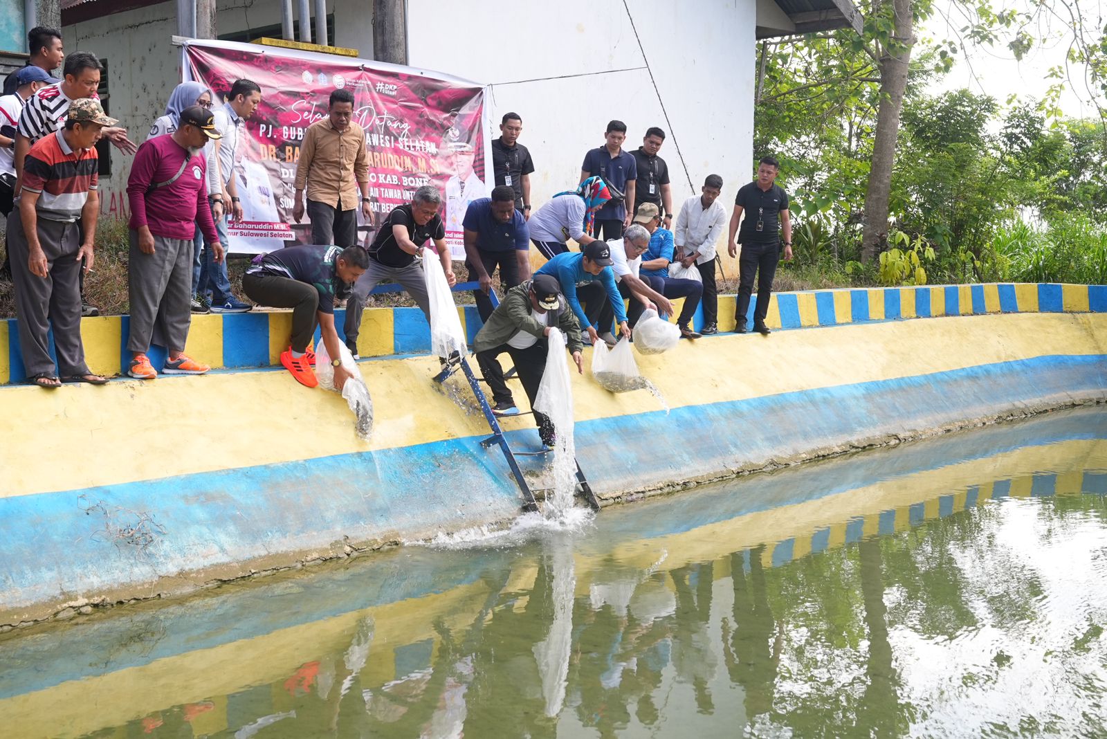 HALILINTARNEWS.id, BONE – Pj Gubernur Sulsel Bahtiar Baharuddin, bersama Kepala Dinas Kelautan dan Perikanan Sulsel, Muhammad Ilyas, dan Pj Bupati Bone, Andi Islamuddin, melepas 21.000 ekor benih ikan Nila di mata air/kolam Wollangi, Desa Wollangi, Kecamatan Barebbo, Minggu, 26 November 2023.
