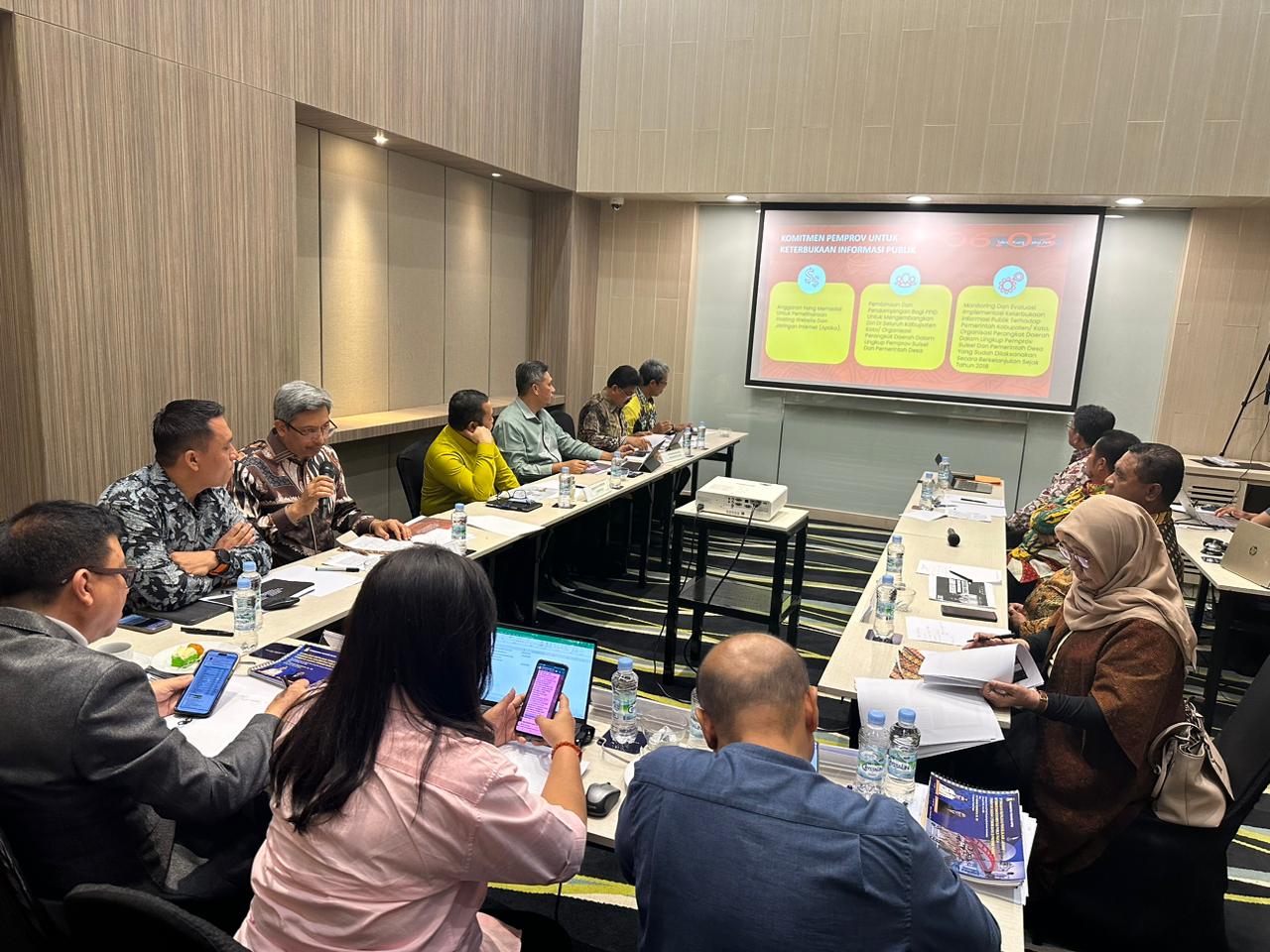 Pj Sekda Sulsel didampingi Kepala Dinas Komunikasi, Informatika, Statistik dan Persandian Provinsi Sulsel, Andi Winarno Eka Putra, Kepala Bidang Humas Erlan Triska, dan para Kepala Bidang di lingkup Diskominfo-SP Sulsel dalam mempresentasikan dihadapan Komisi Informasi Pusat di Hotel Mercure Kemayoran, Jakarta, Kamis (30/11/2023).
