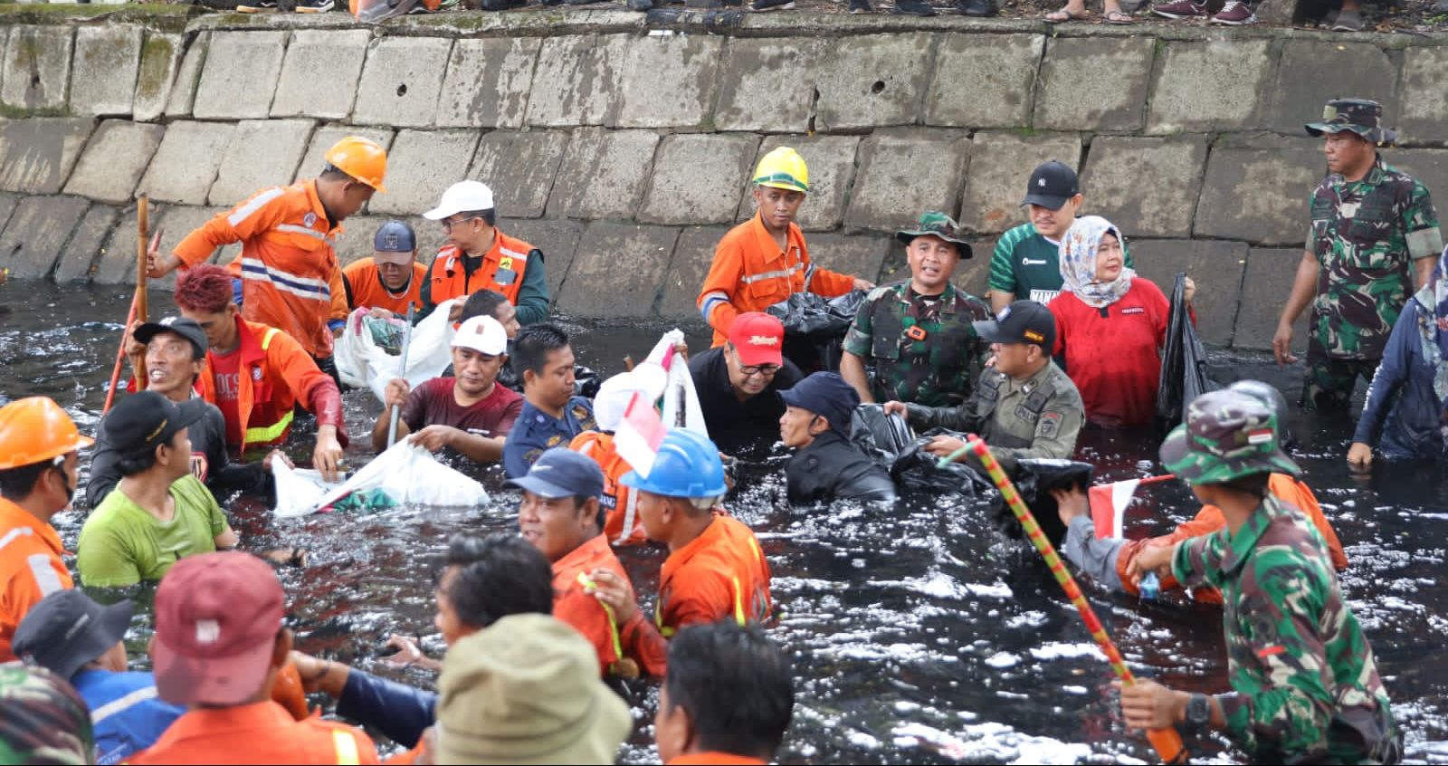 Bikin takjub, Danny Pomanto bersama Dandim 1408/Makassar Letkol Inf Lizardo Gumay turun langsung membersihkan sampah yang ada di sepanjang Kanal Andi Djemma.