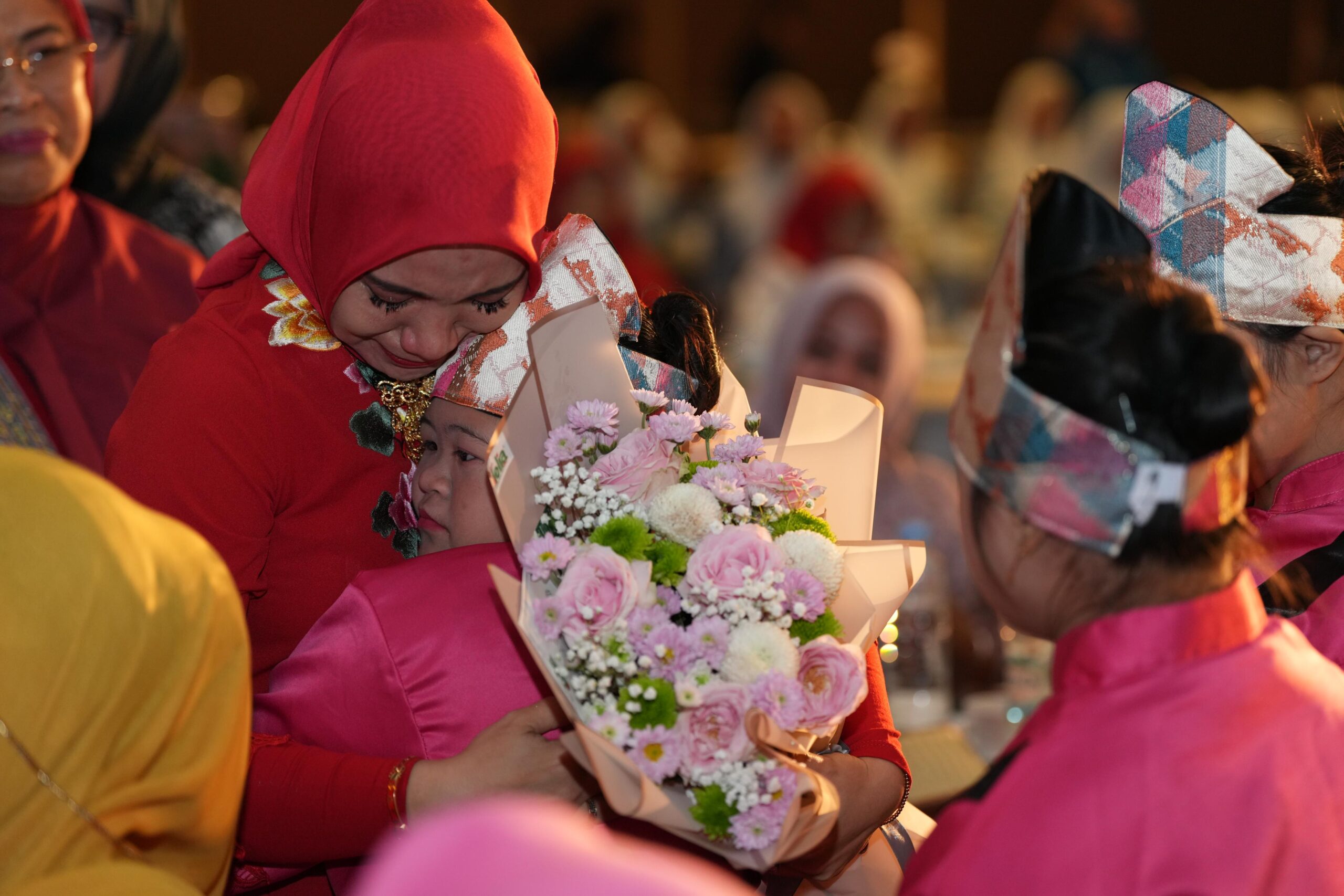 Tangis haru Sofha Marwah dan seluruh undangan yang hadir makin tak terbendung, saat sejumlah anak down syndrome menghampiri Sofha Marwah, seraya memberikan karangan bunga. Mereka pun disambut dengan pelukan hangat dari Bunda PAUD Sulsel ini.