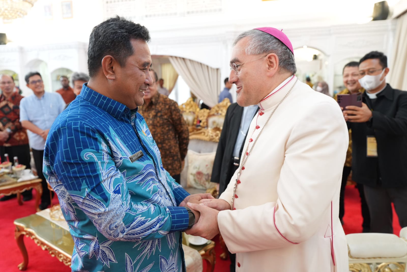 HALILINTARNEWS.id, MAKASSAR – Penjabat Gubernur Sulsel, Bahtiar Baharuddin, menjamu Dubes Vatikan Monsinyur Pioppo, Ketua Konferensi Waligereja Indonesia KWI Monsinyur Anton dan Para Uskup, di Rujab Gubernur Sulsel, Rabu, 31 Januari 2024. Pertemuan silaturahmi yang penuh keakraban tersebut berlangsung kurang lebih satu jam.