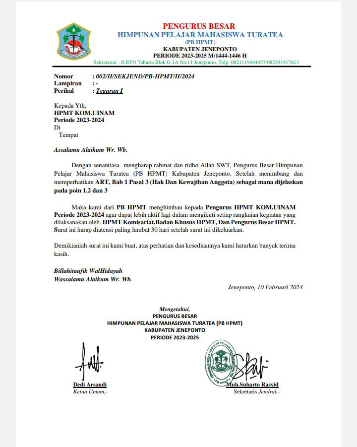 Surat teguran tersebut dikeluarkan pada tanggal 10 Februari 2024. Dalam surat teguran tersebut, PB HPMT mengimbau kepada pengurus HPMT UINAM agar aktif mengikuti kegiatan-kegiatan HPMT (HPMT Komisariat,Badan Khusus HPMT, Dan Pengurus Besar HPMT)