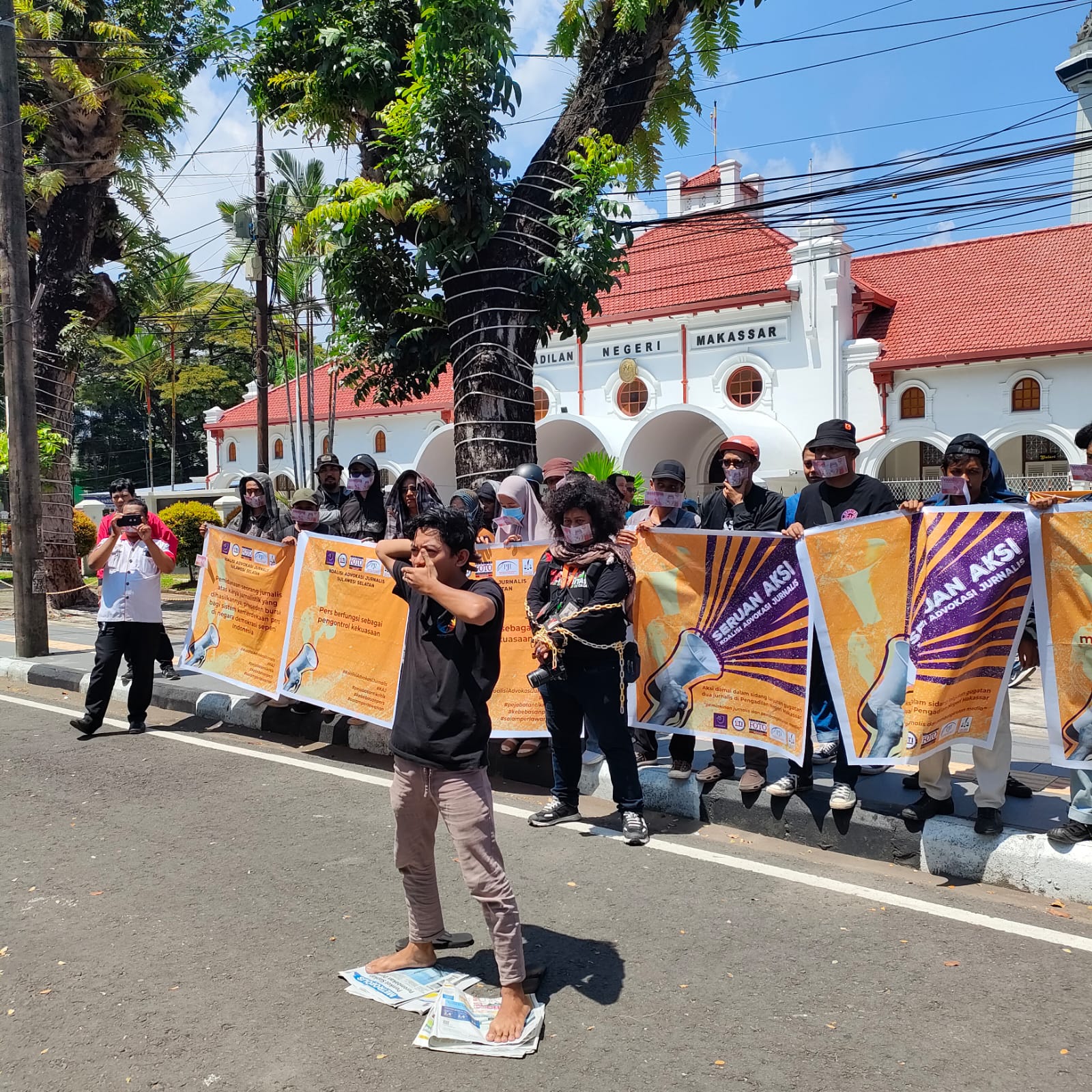 Puluhan jurnalis di Kota Makassar, menggelar aksi damai merespons sidang lanjutan gugatan dua jurnalis di PN Makassar.