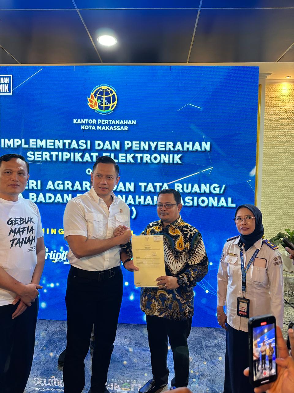 HALILINTARNEWS.id, BANTAENG – Pj. Bupati Bantaeng, Andi Abubakar menerima secara langsung Sertipikat Elektronik yang diserahkan oleh Menteri Agraria dan Tata Ruang (ATR)/Kepala Badan Pertanahan Nasional (BPN), Agus Harimurti Yudhoyono. Penyerahan dilangsungkan di Kantor Pertanahan Kota Makassar, Minggu (28/4/2024).