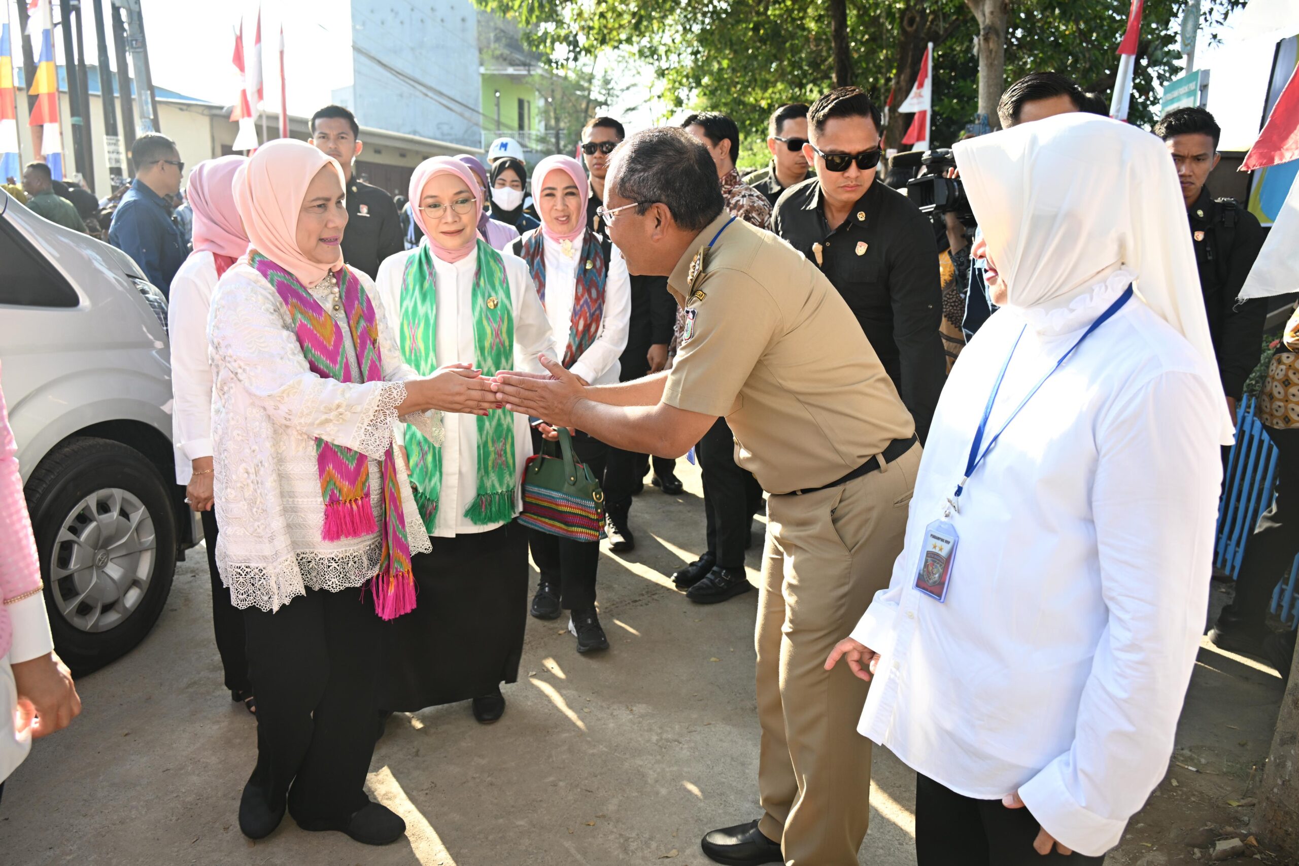 Tiba di lokasi acara, Ibu Negara Iriana Jokowi bersama Wury Estu Ma’ruf Amin dan Organisasi Aksi Solidaritas Era Kabinet Indonesia Maju (OASE KIM) turun meninjau pelayanan yang tengah berlangsung.