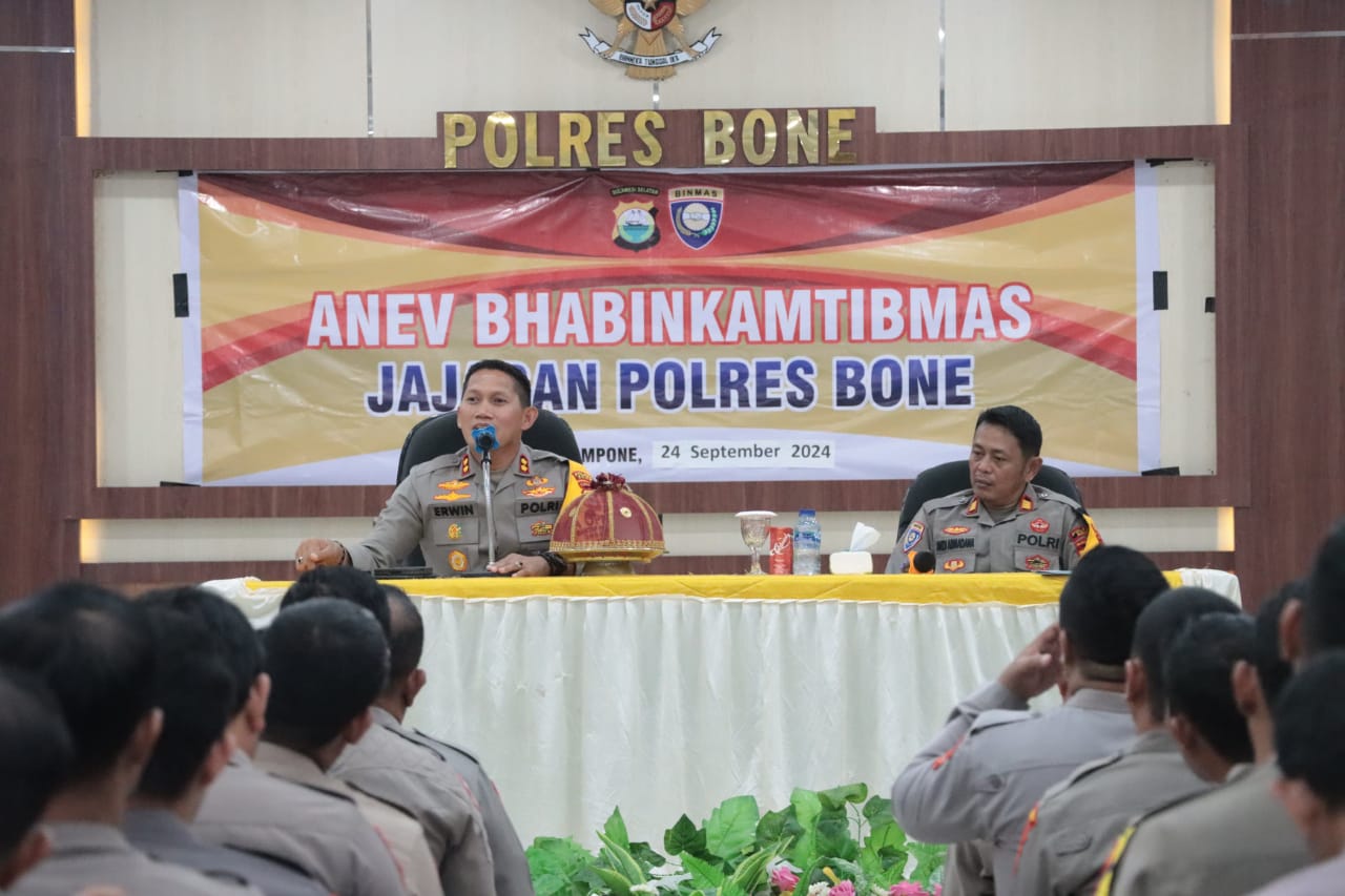HALILINTARNEWS.id, BONE – Kapolres Bone AKBP Erwin Syah, S.I.K.M.H bersama Kasat Binmas AKP Andi Aramadana melaksanakan Analisa dan Evaluasi Bhabinkamtibmas Jajaran Polres Bone di Aula Sarya Arya Racana Polres Bone. Selasa (24/09/2024).