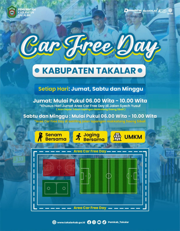 Pj. Bupati Takalar Dr. Setiawan Aswad,.M.Dev,.Plg mengatakan bahwa car free day dilaksanakan seiring dengan penataan ruang publik hijau dan sehat yang setahun ini telah dilakukan di Alun-Alun Kota Takalar dan di sekitar lapangan Makkatang Dg Sibali yang telah dilaunching pada bulan Agustus lalu sebagai pusat olahraga, kuliner dan kegiatan-kegiatan sosial/publik.