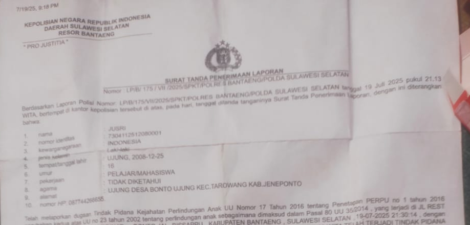 JI yang datang langsung ke Sentra Pelayanan Kepolisian Terpadu (SPKT) Polres Bantaeng pada pukul 21.13 WITA melaporkan bahwa dirinya dikeroyok oleh sekelompok orang di Kelurahan Bonto Atu, Kecamatan Bissappu, Bantaeng. Dalam laporan polisi bernomor LP/B/715/VII/2025/SPKT/Polres Bantaeng/Polda Sulsel, korban mengaku mengalami kekerasan fisik secara tiba-tiba oleh sejumlah pelaku yang sebagian dikenalnya.