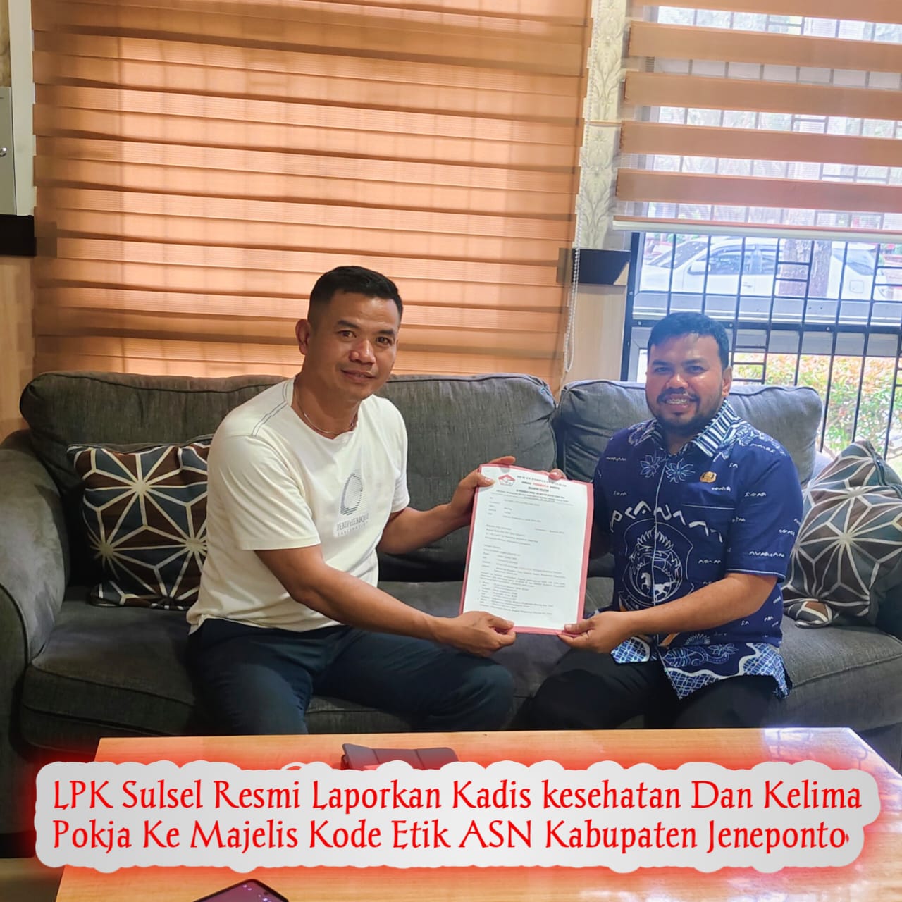 HALILINTARNEWS.id, JENEPONTO – Lembaga Pemberantas Korupsi (LPK) Sulawesi Selatan, Hasan Anwar, resmi melaporkan Kepala Dinas Kesehatan Kabupaten Jeneponto, Susanti A. Mansyur, selaku Pejabat Pembuat Komitmen (PPK), ke Majelis Kode Etik ASN Jeneponto, Kamis (7/8/2025)