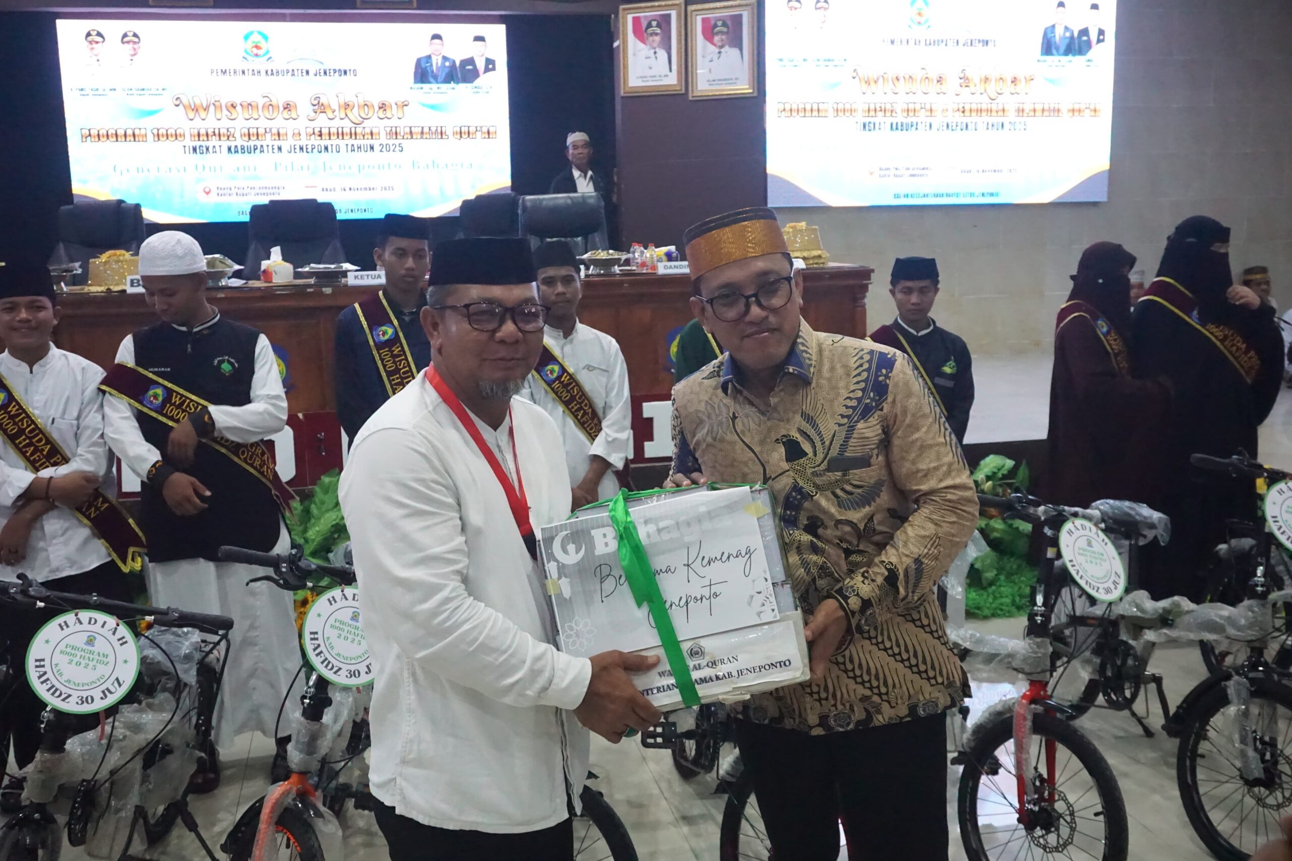 HALILINTARNEWS.id, JENEPONTO — Pemerintah Kabupaten Jeneponto kembali menegaskan komitmennya dalam membangun generasi religius melalui Wisuda Akbar Program 1000 Hafiz Qur’an dan Pendidikan Tilawati Qur’an tingkat kabupaten tahun 2025. Mengangkat tema “Generasi Qur’ani Pilar Jeneponto Bahagia”, kegiatan berlangsung khidmat di Ruang Pola Kantor Bupati Jeneponto, Minggu (16/11/2025).