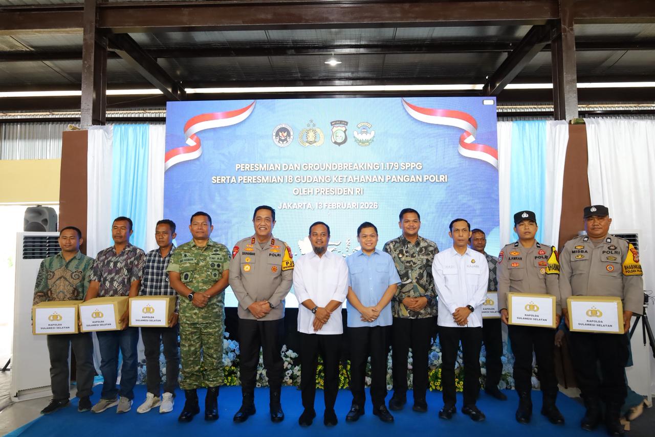 HALILINTARNEWS.id, BANTAENG — Kepala Kepolisian Daerah Sulawesi Selatan, , mengikuti kegiatan Peresmian dan Groundbreaking Satuan Pelayanan Pemenuhan Gizi (SPPG) Polri serta Peresmian Gudang Ketahanan Pangan Polri secara virtual dari Gudang Ketahanan Pangan Polres Bantaeng, Kecamatan Gantarangkeke, Kabupaten Bantaeng, Jumat (13/02/2026).