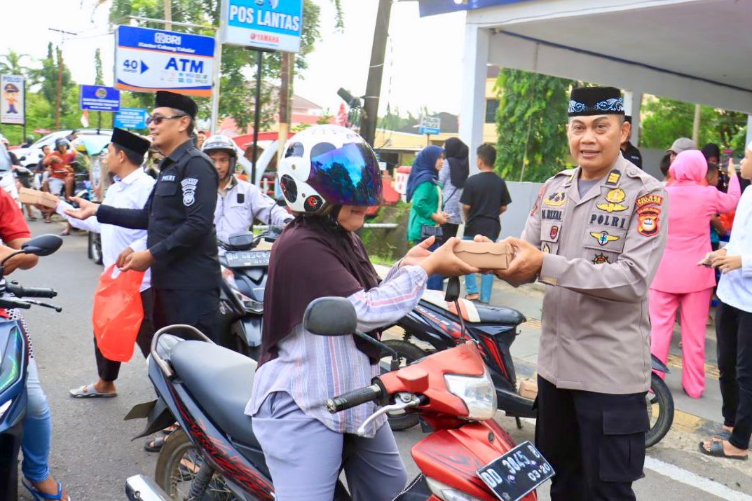 Kegiatan tersebut turut melibatkan Ketua Ny. Tika Supriadi bersama jajaran pengurus, perwakilan organisasi kemasyarakatan, tokoh agama, mahasiswa, serta ibu-ibu Bhayangkari Sie Humas. Kebersamaan tampak terasa saat seluruh elemen berbaur menyapa warga dengan ramah sambil menyerahkan takjil secara langsung.